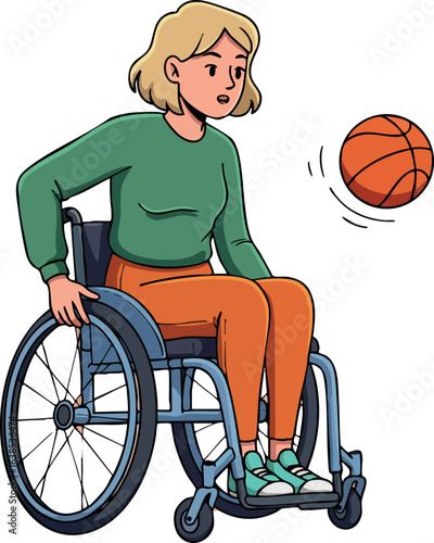 © DesignVectX, Fototapeta premium Woman in wheelchair playing basketball with orange ball active lifestyle vector illustration