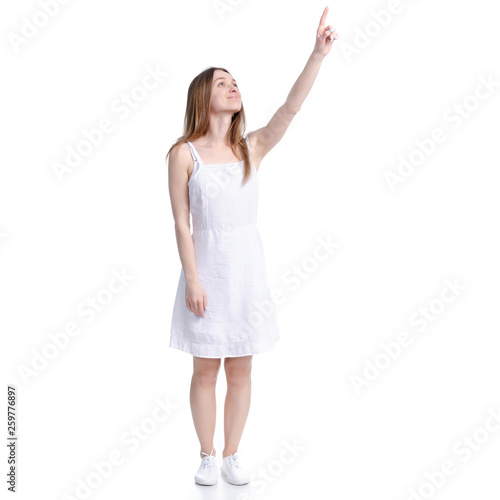 © Kabardins photo, Naklejka premium Woman in white dress showing pointing on white background isolation