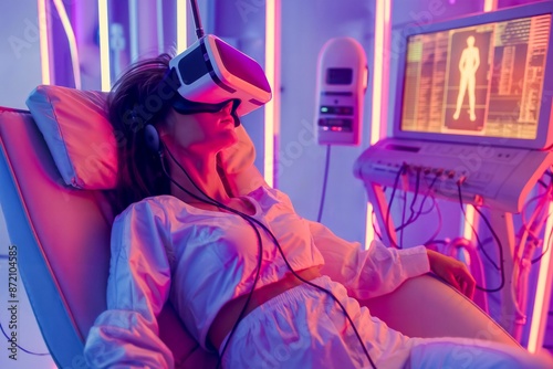 Obraz premium Woman in white outfit using VR headset in a futuristic room with neon lights and medical equipment
