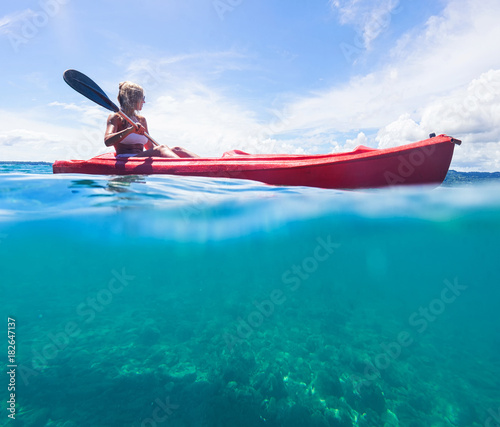 © upslim, Fototapeta premium Woman in white swimwear on kayak explore blue sea. Split photo. Selective focus.