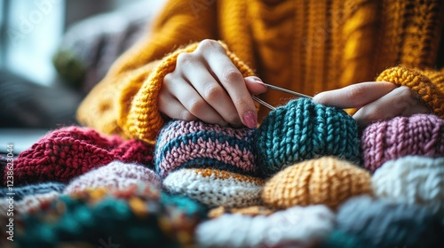 © Aziz, Fototapeta premium Woman in Yellow Sweater Knitting Colorful Yarn Balls