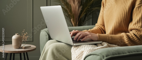 Fototapeta premium woman in yellow sweater working on a laptop in a cozy armchair