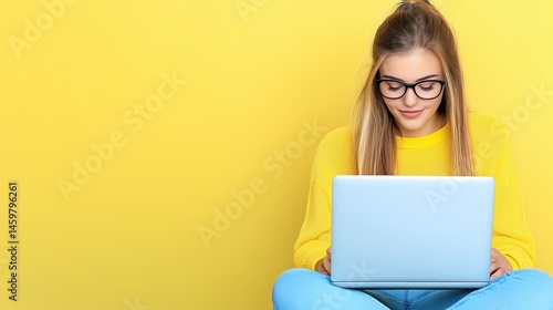 © SerPhoto, Naklejka premium Woman in yellow sweater working on laptop against a bright yellow background in a casual indoor setting