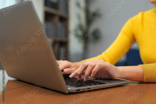 Fototapeta premium Woman in yellow top typing on laptop at wooden desk, close up of hands working remotely in a cozy home office environment
