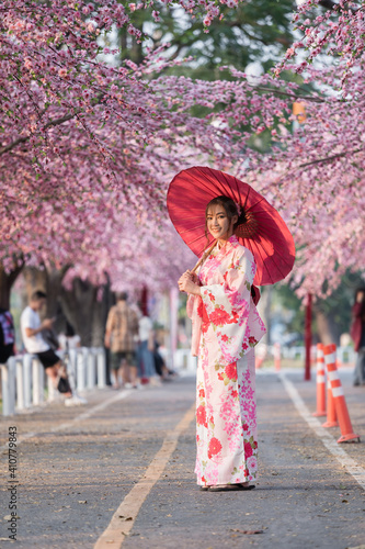 © geargodz, Fototapeta premium woman in yukata (kimono dress) holding umbrella and looking sakura flower or cherry blossom blooming in garden