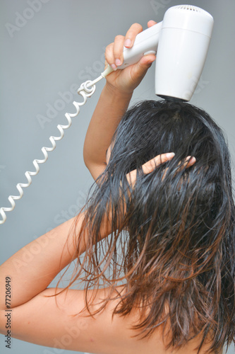 © Sunanta, Naklejka premium woman is blowing her hair with hair dryer
