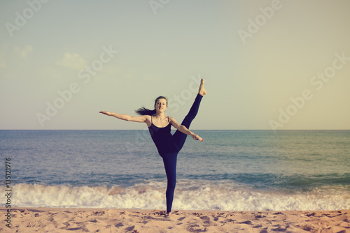 Fototapeta premium Woman is doing fitness, sunny blue sky sand beach outdoors background