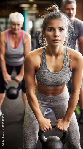 © Eva Corbella, Obraz premium Woman is lifting two dumbbells while two person watch