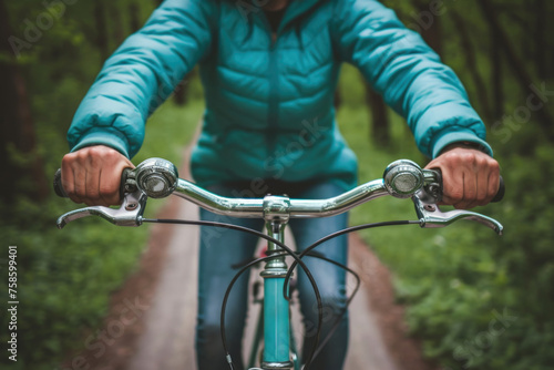 Obraz premium Woman is riding bicycle down path