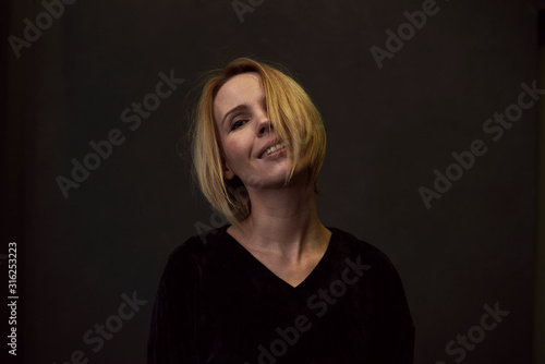 © Konstiantyn Zapylaie, Fototapeta premium Woman is smiling on a dark background.