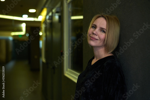 Obraz premium Woman is smiling on a dark background.