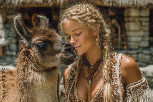 © Georgii, Obraz premium Woman joyfully bonding with a llama in a rustic setting outdoors