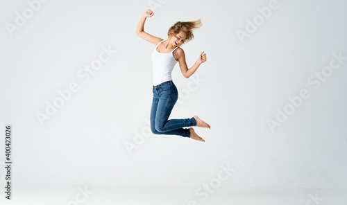 Fototapeta premium woman jumped up on a light background in full growth sport fitness
