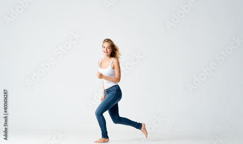Fototapeta premium woman jumped up on a light background in full growth sport fitness