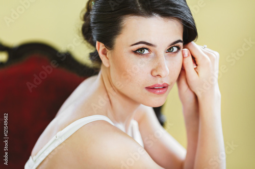 © veles_studio, Obraz premium Woman kneeling on red armchair