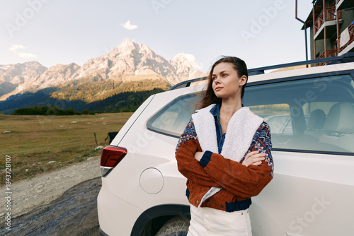 Fototapeta premium Woman leaning against white car in mountains landscape, portrait of a confident traveler on a roadtrip. Travel adventure outdoors scene with warm jacket, arms crossed and serene scenery.