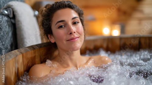 © Maksym, Obraz premium Woman leaning back in wooden cold plunge tub, ice floating around shoulders, indoor spa with warm tones, relaxation and wellness captured
