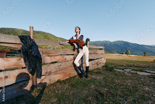 © SHOTPRIME STUDIO, Fototapeta premium Woman leaning on wooden fence in countryside mountains holding a hat and jacket, wearing boots and casual outfit outdoors, enjoying scenic meadow, freedom and relaxed travel mood.
