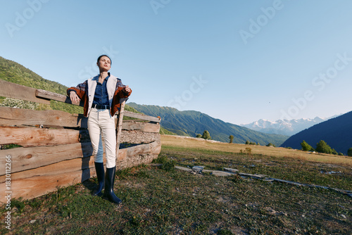 © SHOTPRIME STUDIO, Fototapeta premium Woman leans on wooden fence in alpine meadow against distant mountains, countryside travel scene. Casual outfit with boots, relaxed portrait in wide open landscape under clear blue sky.