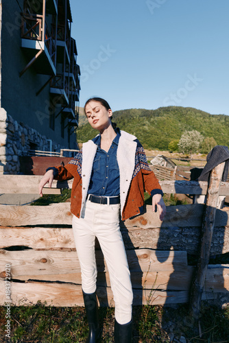 Fototapeta premium Woman leans on wooden fence in countryside with denim jacket, boots and white pants, posing relaxed against mountains and sunlight for fashion portrait, rural lifestyle and travel.