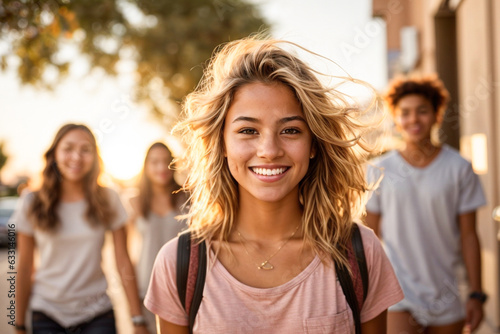 Obraz premium woman leisure adult young smiling sun city sunny day sunset beautiful cheerful enjoy a walk walking with friends outdoor activity in the city, portrait, happy, fashion, outside, having fun, lifestyle