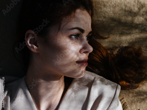 © SHOTPRIME STUDIO, Fototapeta premium Woman lies on the ground outdoors for leisure close-up