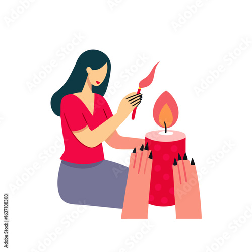 © Shakeela, Obraz premium Woman Lighting a Candle with Red Nails