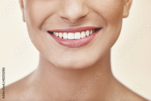 © peopleimages.com, Obraz premium Woman, lips and teeth in studio for beauty with makeup, cosmetics and glow with pride for cosmetology or self care. Girl, zoom and isolated with happiness for natural shine and aesthetic for mouth.