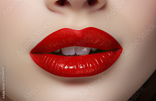 Obraz premium Woman Lips Closeup, Red Lipstick Makeup, Beautiful Mouth Make-Up, Model Girl...