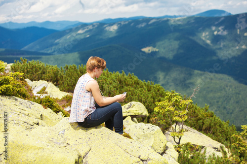 © lighthousestock, Naklejka premium Woman listen to music on phone