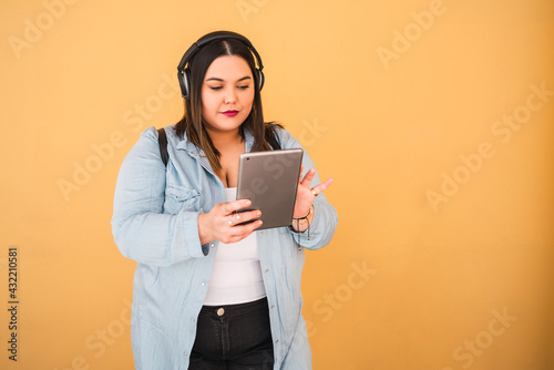 Fototapeta premium Woman listening music with headphones and tablet.