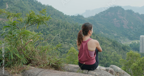 © leungchopan, Naklejka premium Woman look at the city view from top