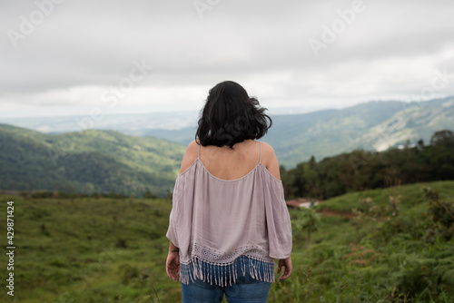 Naklejka premium woman looking at the horizon in the field, woman in the mountains.