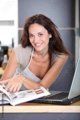 © goodluz, Obraz premium Woman looking for recipe in cookbook