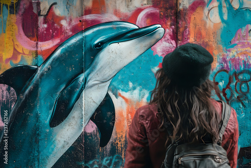 Obraz premium Woman lookung at dolphin graffiti in a street, city graffiti, dolphin art,...