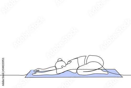 © Kamila Bay, Fototapeta premium woman lying on mat in yoga pose stretching her back - one line drawing vector. concept stretching in child exercise