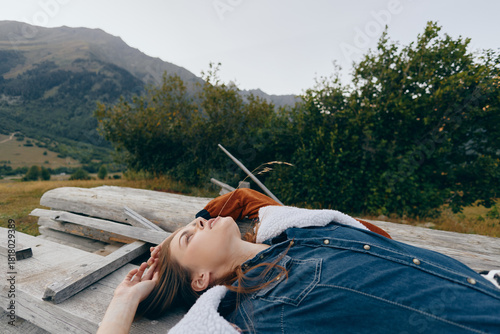 © SHOTPRIME STUDIO, Fototapeta premium Woman lying on wooden bench in nature with mountains background, relaxed portrait in denim jacket outdoors, cozy layers and peaceful relaxation during countryside escape.