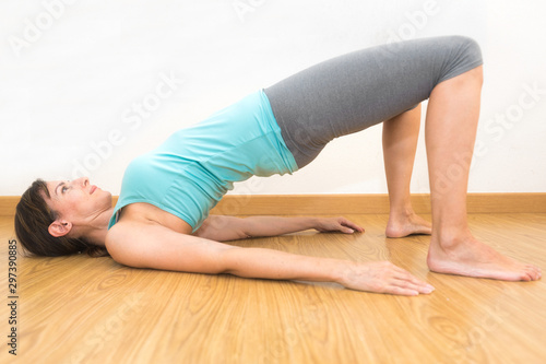 © herraez, Fototapeta premium Woman makes yoga position in yoga studio. Yoga practice .