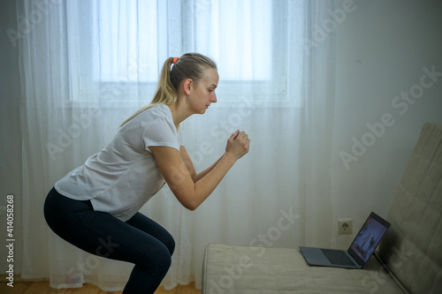 © Evgeniy Agarkov, Fototapeta premium Woman making fitness with online instructor