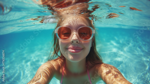 © MagicsPhotos, Fototapeta premium woman making selfie underwater,ai