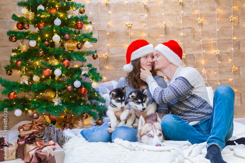 © erainbow, Obraz premium Woman, man, dogs husky, Christmas tree, hat