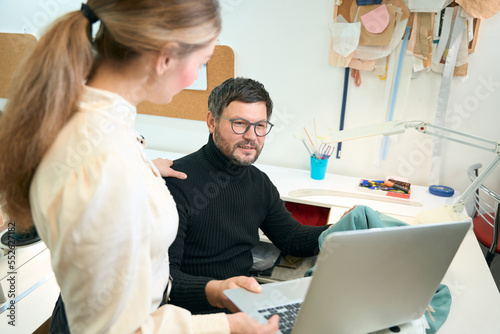 © Svitlana, Obraz premium Woman manager with laptop put her hand on shoulder man designer