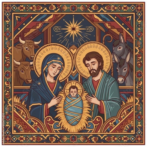 © Margarita Ratatosk, Obraz premium Woman Mary, man Joseph, and baby Jesus in the Nativity scene. Christian Christmas holiday. Biblical religious illustration for greeting card design.