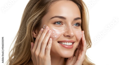 Fototapeta premium Woman massages radiant face cream enhancing beauty