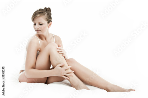 Obraz premium Woman massaging legs sitting on white background