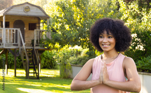 © WavebreakMediaMicro, Fototapeta premium Woman meditating on lawn by wooden playhouse and planter box in suburban backyard, copy space