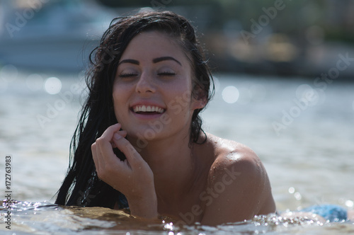 © pipehorse, Obraz premium Woman model at the beach in bright sunlight.