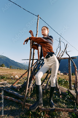 © SHOTPRIME STUDIO, Fototapeta premium Woman model countryside mountains pose by rustic wooden structure wearing sweater, scarf and boots in field. Fashion portrait outdoor with natural landscape and casual style.