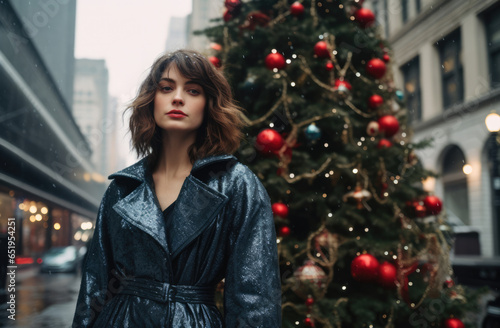 Fototapeta premium Woman next to the Christmas tree under a snowfall