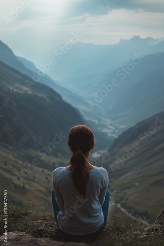 © Alexandr, Naklejka premium Woman on rock overlooking valley